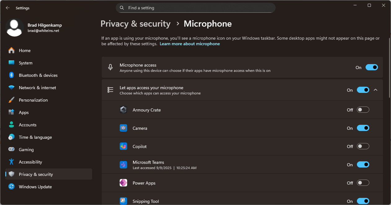When you have tested your mic and camera and you still cannot be heard or seen in a Teams meeting, sometimes it's because of the Windows privacy settings. Under Settings -> Privacy & Security, under the App permissions section, there is the option for Camera and also for Microphone. On each, make sure that access is turned on, and also that the Teams app has access to the microphone/camera.
